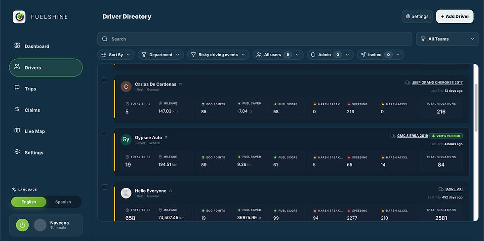 Mobile telematics platforms provide operations teams with real-time visibility previously impossible for grey fleets. Fuelshine's live GPS dashboard displays every driver's location, speed, safety score, and trip status updated every 3-8 seconds on a single map. Managers can filter by team, drill down into individual trips, and export data without switching between multiple tools.